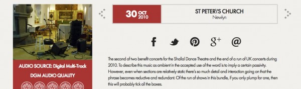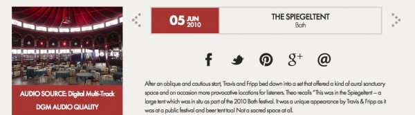 Five shows from Travis & Fripp's short UK tour in 2010 are available to download either as individual concerts or as a bundle. Each concert has been mixed by Alex 'Stormy' Mundy and features the duo playing some remarkably powerful music.