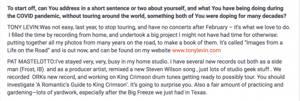 Pat Mastelotto and Tony Levin have been chatting. . .