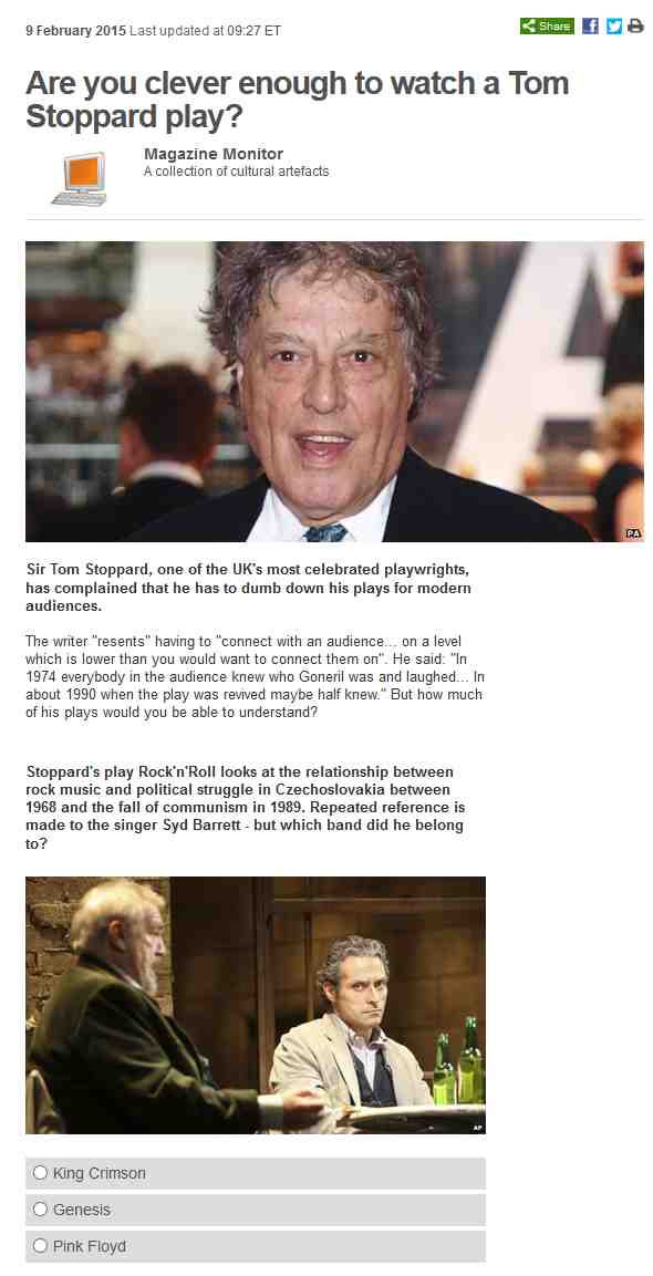 My thanks to Richard Royston for spotting this appearance of King Crimson in a quiz about noted playwright Tom Stoppard.